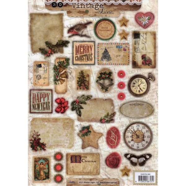 This die cut sheet is crammed with vintage Christmas style objects, tags and greetings.